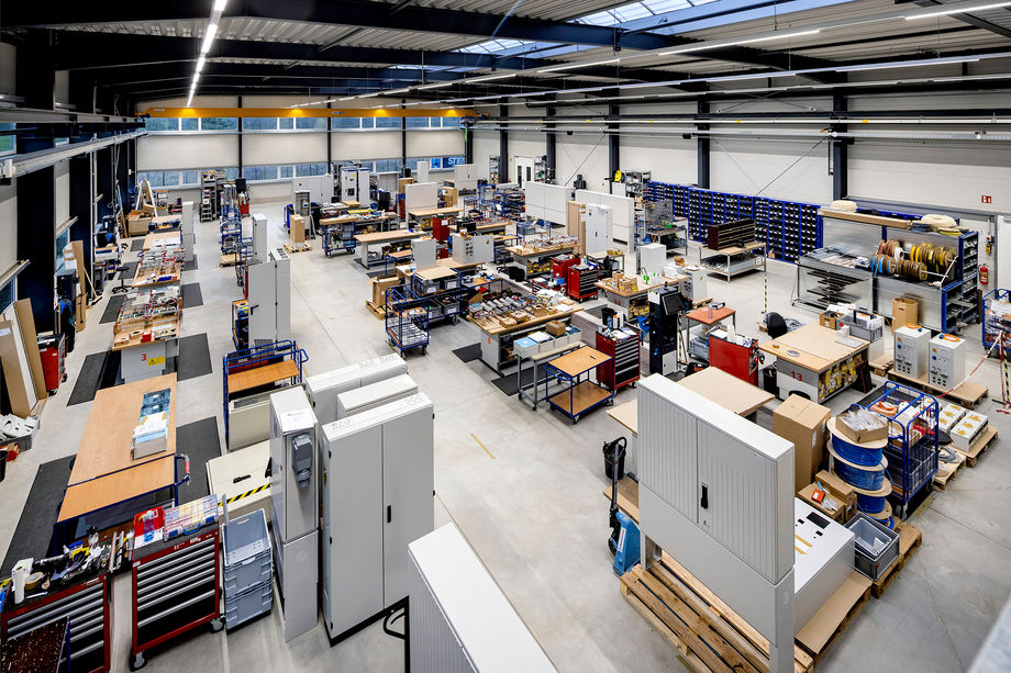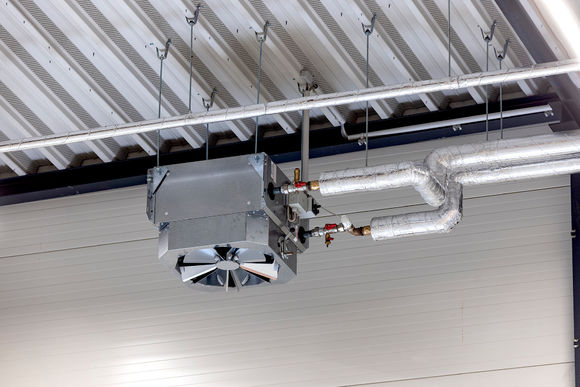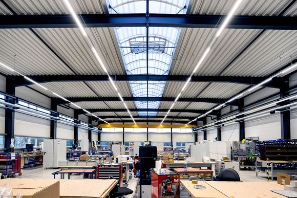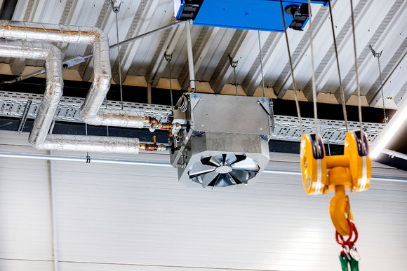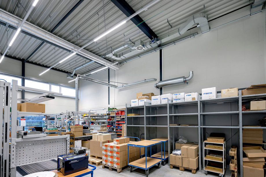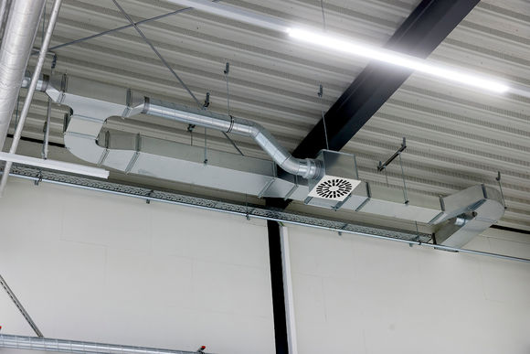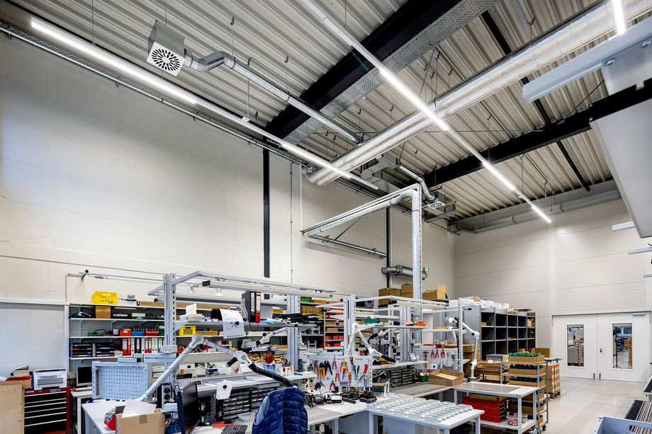 Öffentliche Bereiche im Vrielmann-Neubau wie die Besprechungsräume, die Kantine oder Flure werden mit Konvektoren und Ventilatorkonvektoren beheizt. In den Fluren kommen sechs Haubenkonvektoren der Serie PowerKon zum Einsatz. Die Kantine und Besprechungsräume werden über sieben Venkon Fan Coils mit Schnellkühl- und -aufheizfunktion versorgt und sind in der Zwischendecke installiert. Zusammen mit den Luftdurchlässen sorgen sie für eine bestens aufeinander abgestimmte Verteilung der Luft im Raum. Insgesamt acht TOP Lufterhitzer werden zur Wärmeversorgung der Produktionshallen eingesetzt. Ausgestattet sind sie mit KaMax-Luftauslässen, die für eine komfortable Luftverteilung von sehr hohen Decken bis in den Aufenthaltsbereich von Personen sorgen. Die Lufterhitzer arbeiten mit geräuscharmen Sichelleiseläufer-Ventilatoren, die zusammen mit der optimierten Volldüse äußerst leise sind und somit eine ruhige Arbeitsatmosphäre gewährleisten. Für weiteres Wachstum ist die Vrielmann GmbH gerüstet. Das Gebäude kann problemlos erweitert werden.
