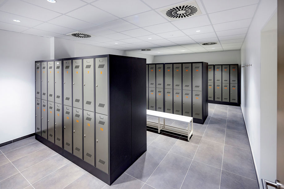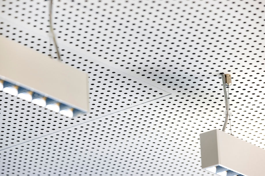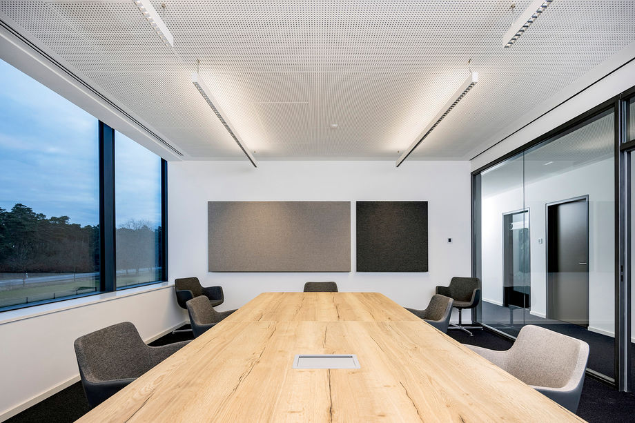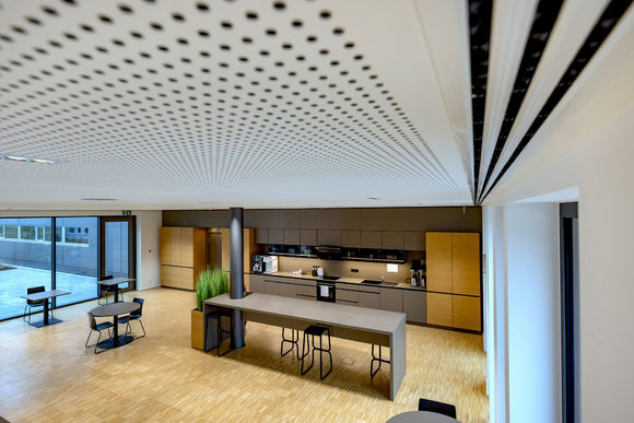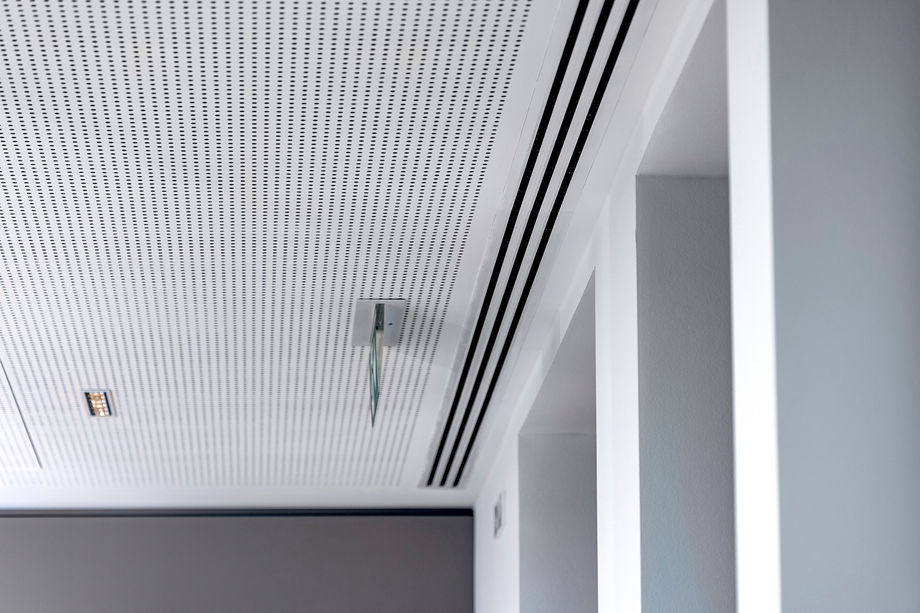 Mit dem Kontaktkühl- und Heizflächensystem lässt sich eine geschlossene Strahlungsdecke herstellen. Sie zeichnet absolute Stille, flexible Verarbeitungsmöglichkeiten sowie eine hohe Energieeffizienz aus. Die flexiblen Verarbeitungsmöglichkeiten sorgen dafür, dass sich die Gipskartondecke bereits in der Planung problemlos an architektonische Gegebenheiten anpassen lässt. Auch die Luftdurchlässe stammen von Kampmann. Installiert wurden dreizehn Drallluftdurchlässe des Modells DAL359 sowie 55 Schlitzluftdurchlässe des Typs SAL35 in der Gipskartondecke. Sie sorgen nun in den Büro- und Besprechungsräumen sowie der Kantine für einen optimalen Luftaustausch. Beide verfügen über einen niedrigen Schallleistungspegel und sorgen für eine behagliche Lufteinbringung.