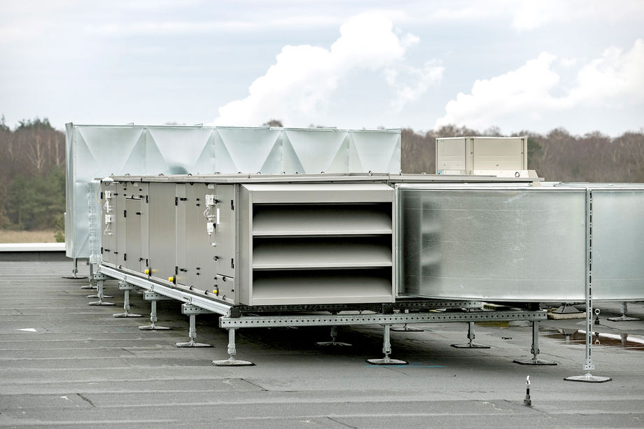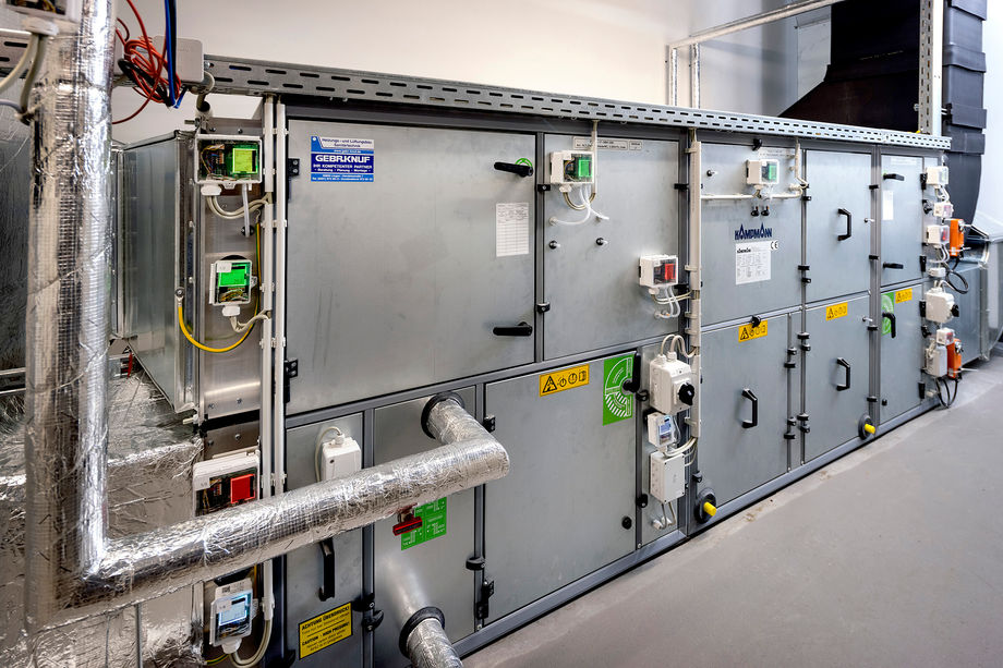 Die beiden installierten RLT-Geräte, die 8.000m³/h bzw. 3.300m³/h umfassen, funktionieren mit einem Gegenstromwärmetauscher. Dieser dient zur Kälterückgewinnung im Sommer sowie zur Wärmerückgewinnung im Winter. Dabei wird die thermische Energie von einem auf den anderen Luftstrom übertragen, ohne dass sie sich direkt vermischen. Eine gegebenenfalls notwendige Nachkühlung bzw. -heizung erfolgt über ein integriertes Kombiregister.
