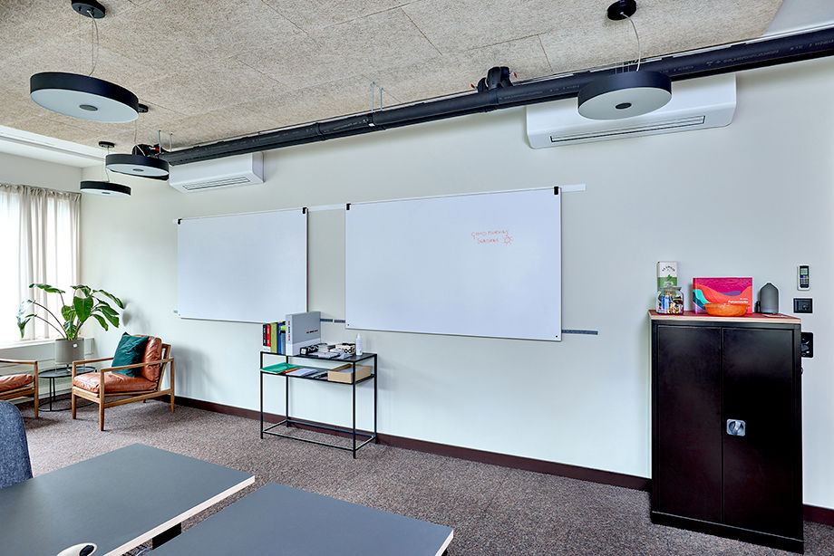 Für das optimale Raumklima sorgt eine Systemlösung von Kampmann: Zum Einsatz kommen 10 KaDius Deckengeräte und mehrere KaCool W Wandgeräte, gesteuert über die Kampmann Raumregelung mit KaController. Die Kombination aus effizienter Kühl- und Heizleistung, smarter Regelung und modernem Design ermöglicht ein Höchstmaß an Komfort – ideal für Arbeitsumgebungen, die sich ständig verändern.